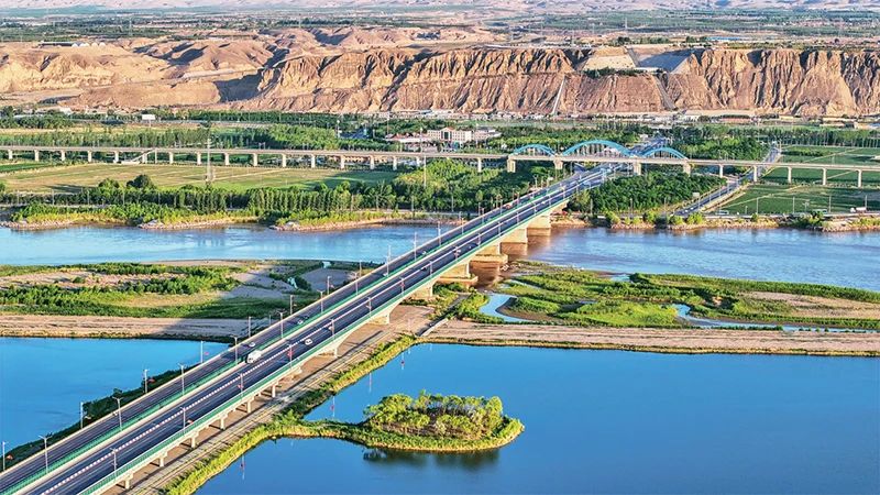 新時代生態(tài)文明建設的成就舉世矚目,成為新時代黨和國家事業(yè)取得歷史性成就、發(fā)生歷史性變革的顯著標志。圖為2023年6月13日,位于寧夏中衛(wèi)的黃河公路大橋、黃河鐵路大橋與黃河濕地交相輝映,美麗如畫。人民圖片 柴更利/攝